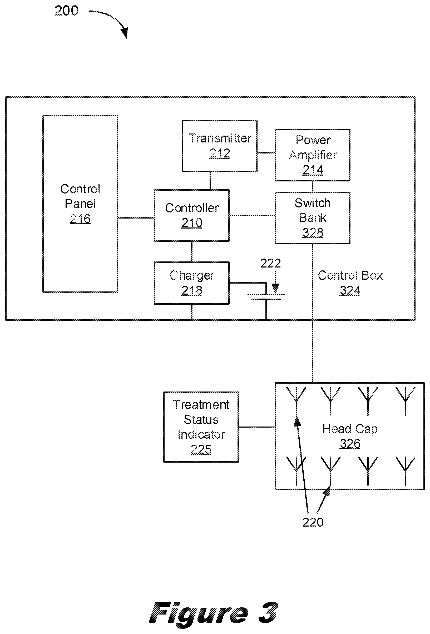 The portable, wearable, proximal Alzheimer's disease treatment invention is based upon creating an RF field of particular frequencies and intensities that are applied to the patient's head. To accomplish the aforementioned disease treatment functionality, a system was invented comprising a network of antennas connected to an RF generator via a feedline connector. The invention also provides methods for using measurements to monitor and manage the effectiveness of an ongoing disease treatment regimen, and databases which contain information about measurements, variables, and their relationships to clinical outcome.
